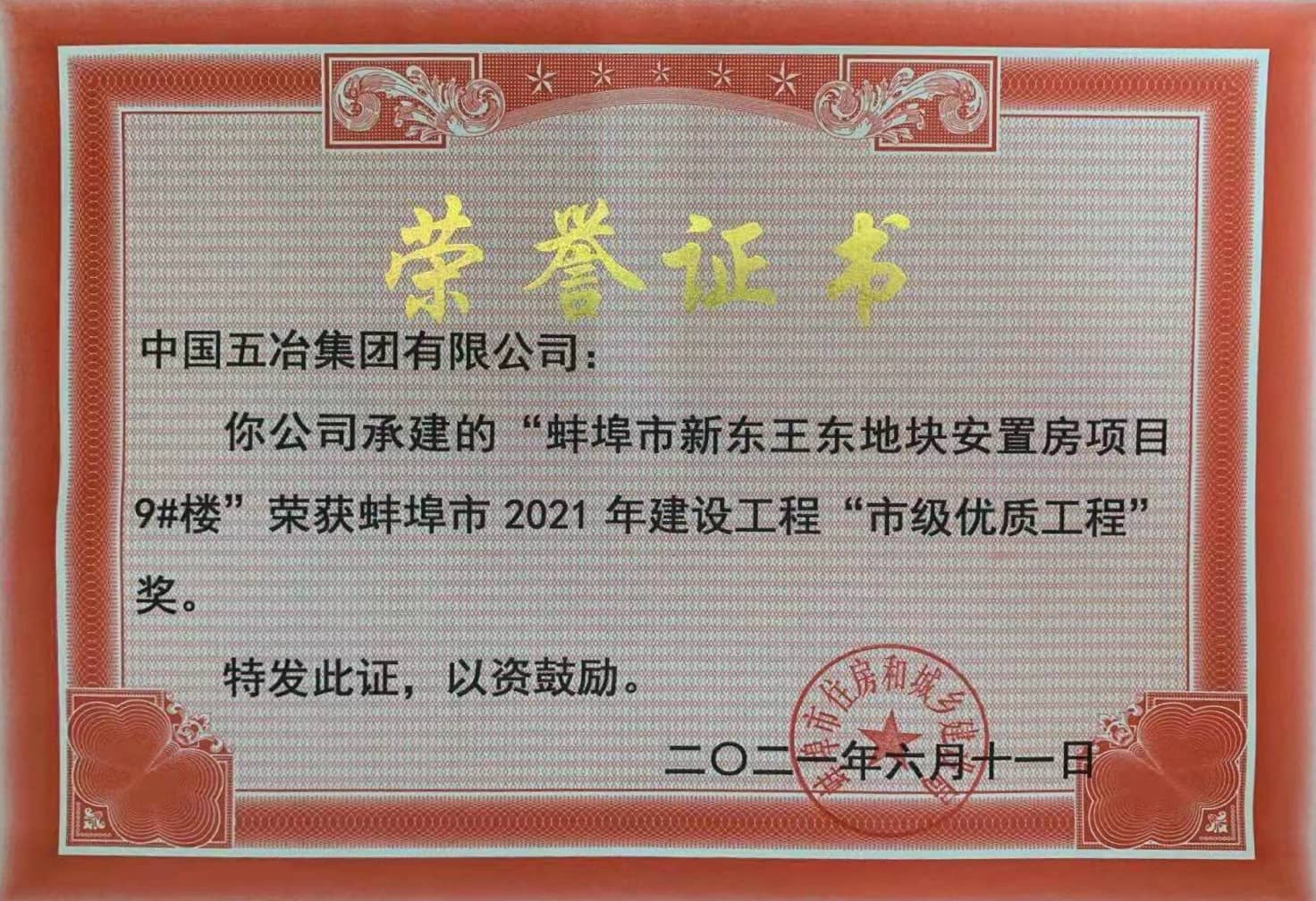 蚌埠市新東王東地塊安置房項目9#樓榮獲蚌埠市2021年建設工程“市級優質工程”獎
