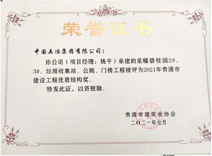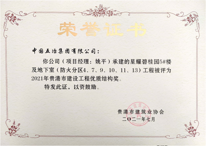 星耀碧桂園5#及地下室工程—2021年貴港市建設工程優質結構獎