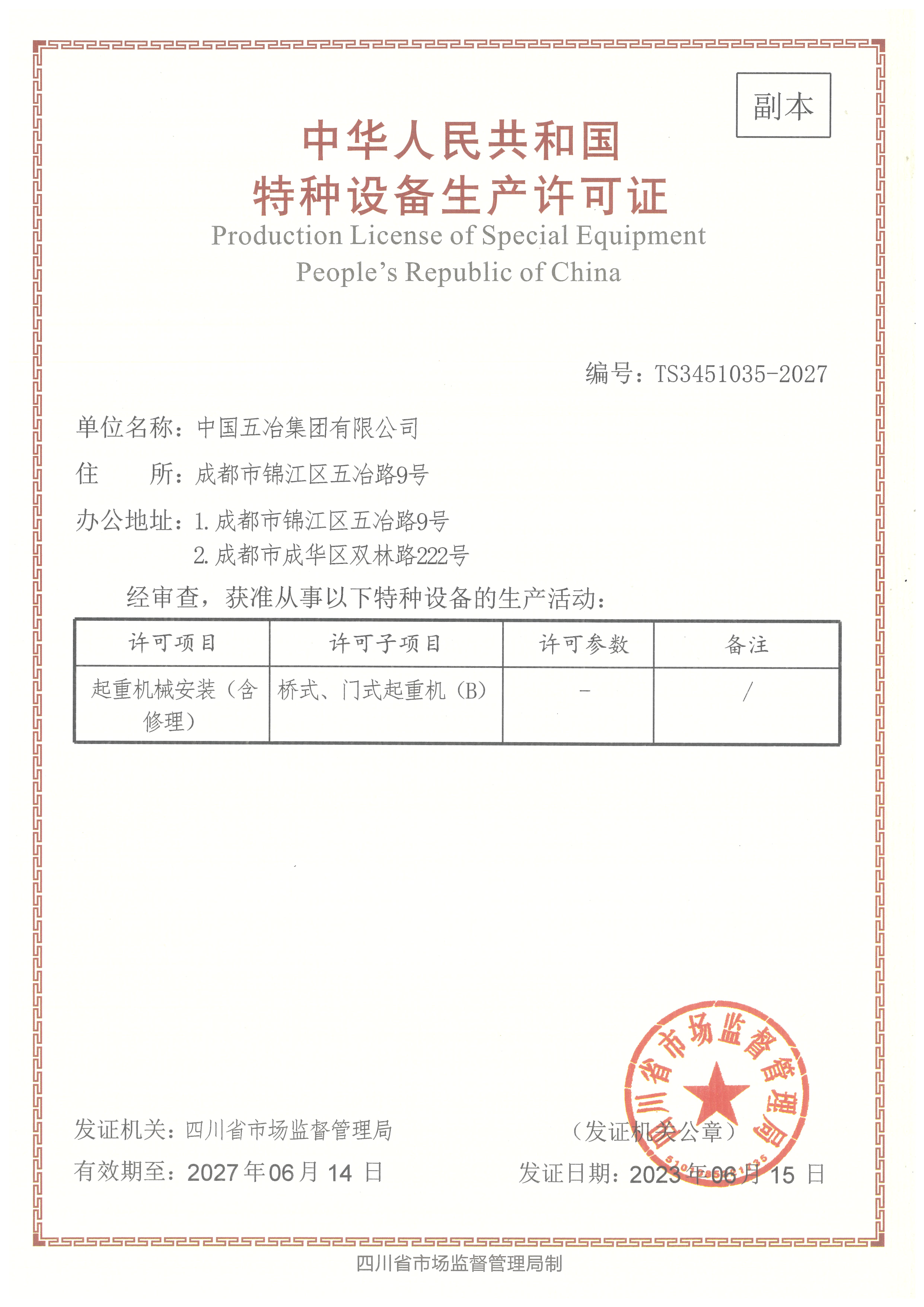 特種設備生產許可證(起重機械安裝)
