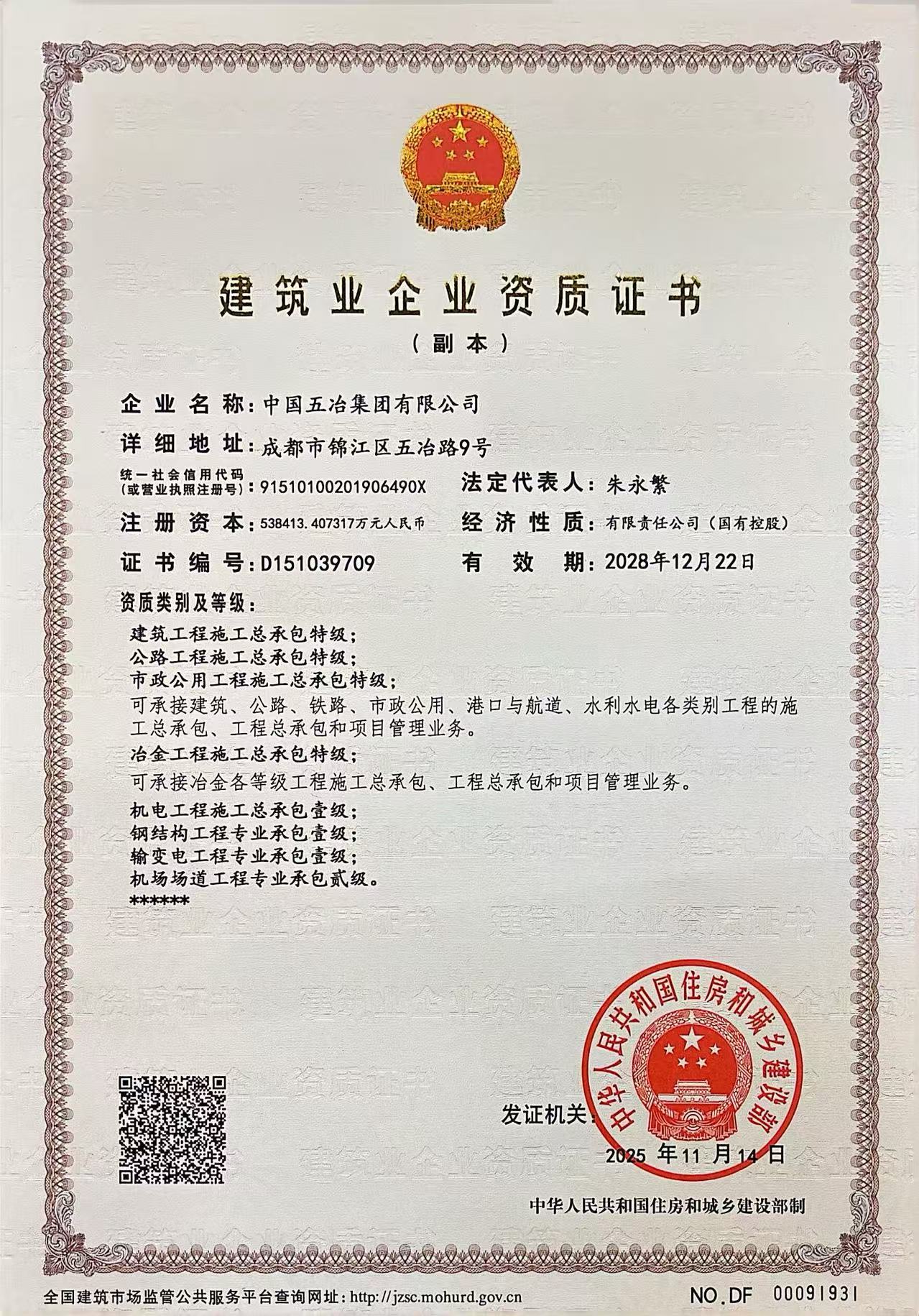 建筑業企業資質證書(建筑、市政、公路、冶金特級)