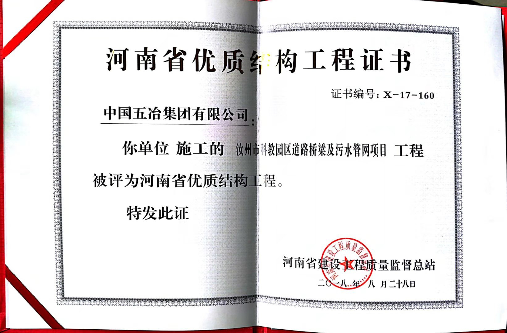 汝州科教園道路橋梁及污水管網工程榮獲2017年下半年度河南省優質結構工程獎