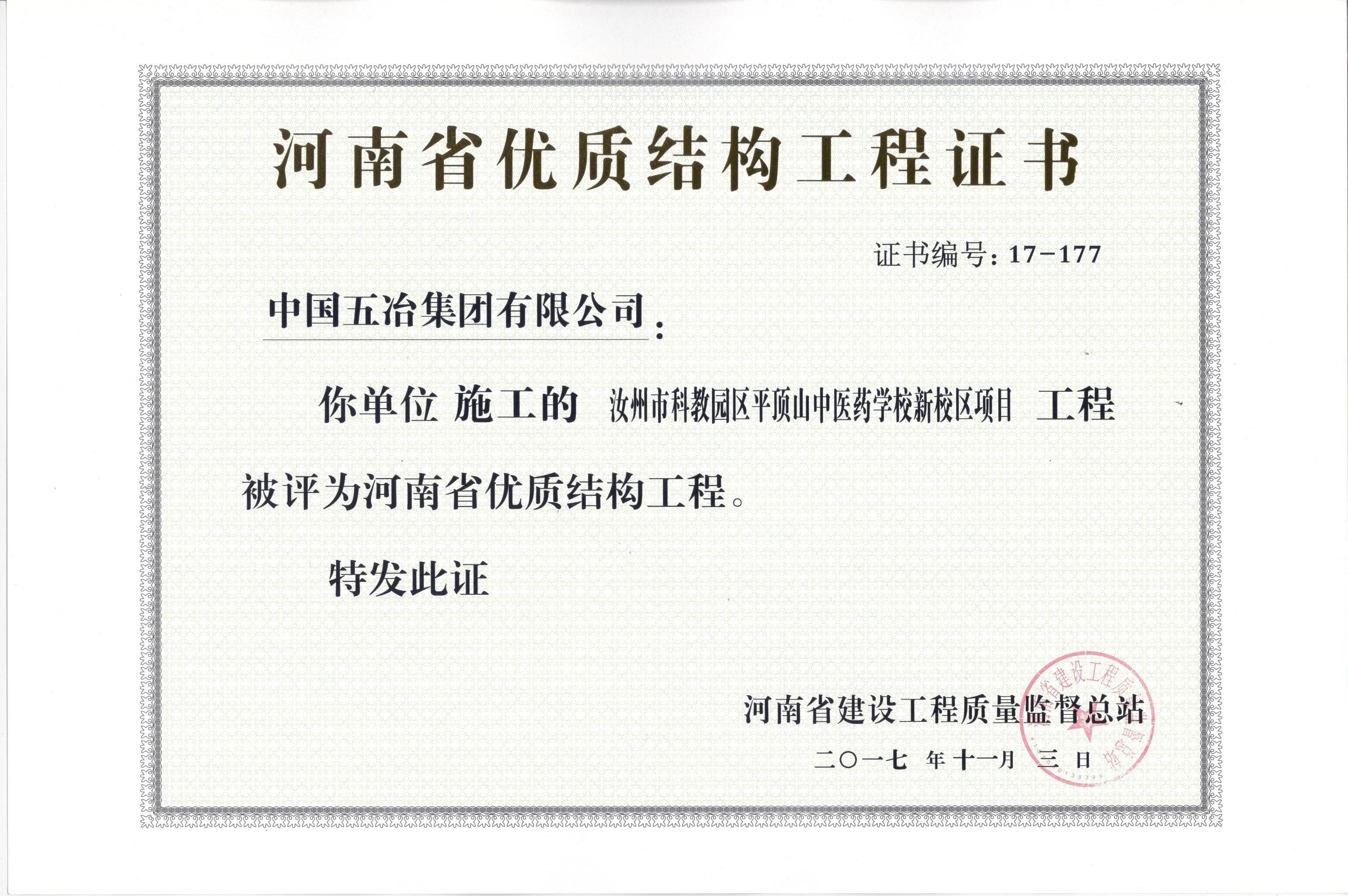汝州市科教園區平頂山中醫藥學校新校區項目榮獲2017年河南省優質結構工程獎