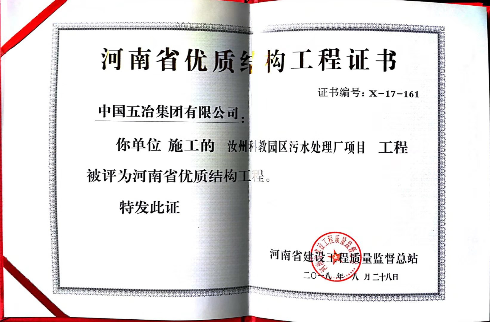 汝州科教園污水處理廠工程榮獲2017年下半年度河南省優質結構工程獎