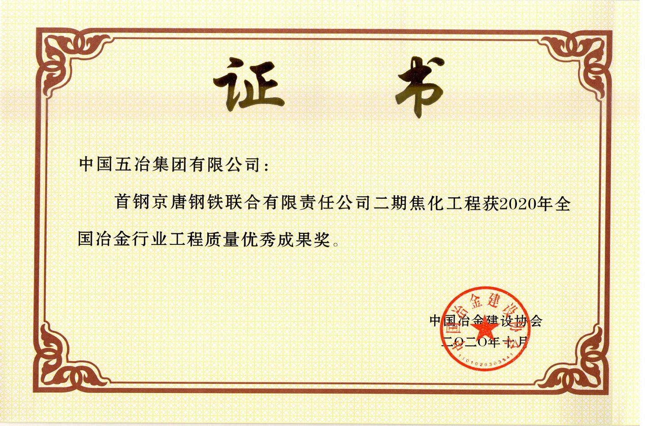 首鋼京唐鋼鐵聯合有限責任公司二期焦化工程榮獲2020年全國冶金行業工程質量優秀成果獎