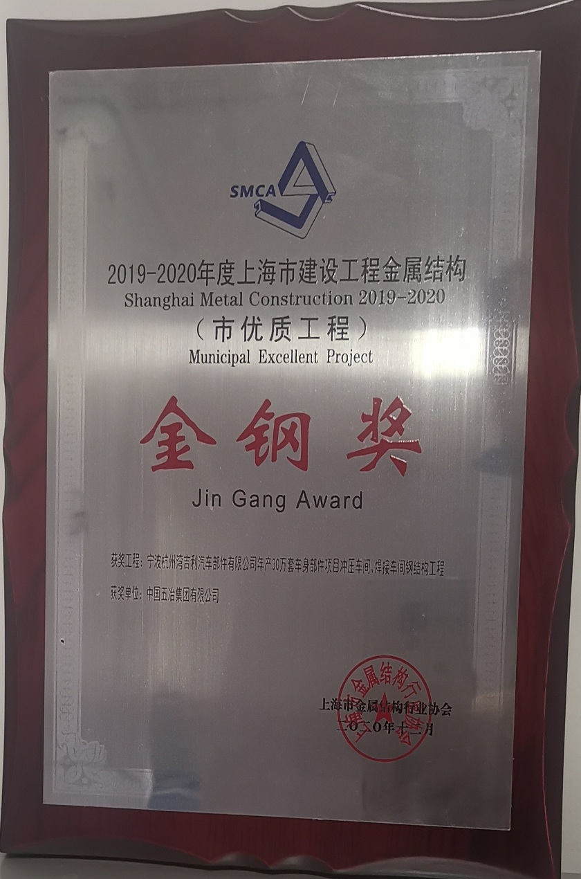 寧波杭州灣吉利汽車部件有限公司年產(chǎn)30萬套車身部件項目標準車間鋼結構工程獲2019-2020年度第二批上海市建設工程金屬結構“金鋼獎”(市優(yōu)質工程)